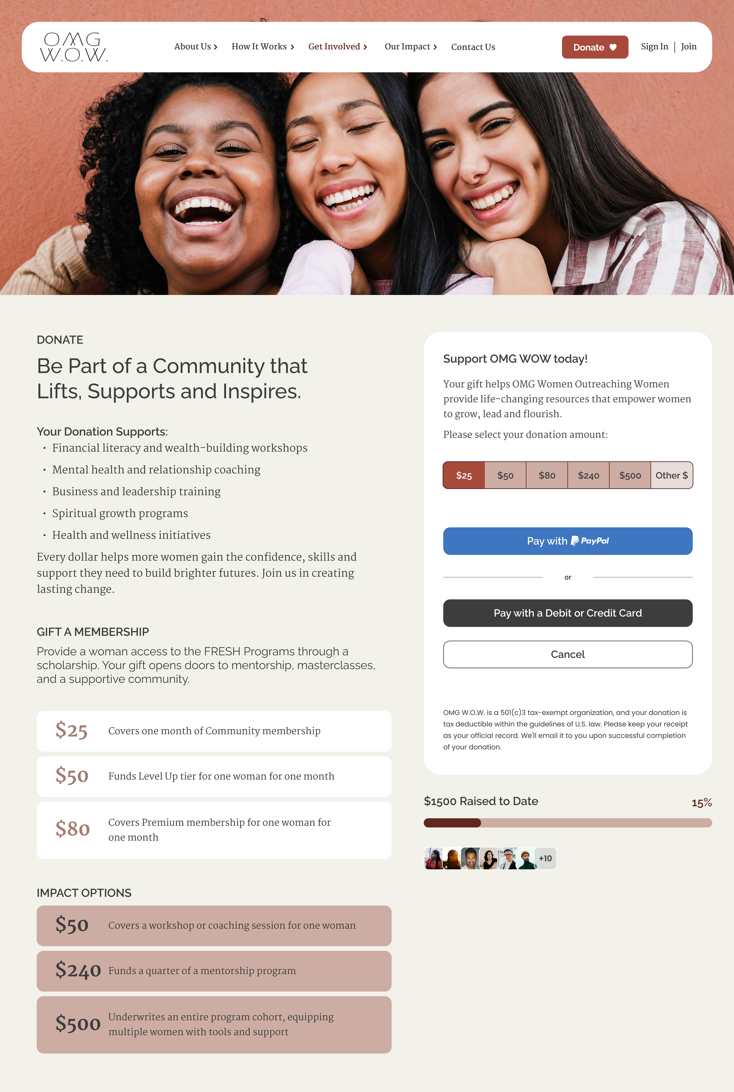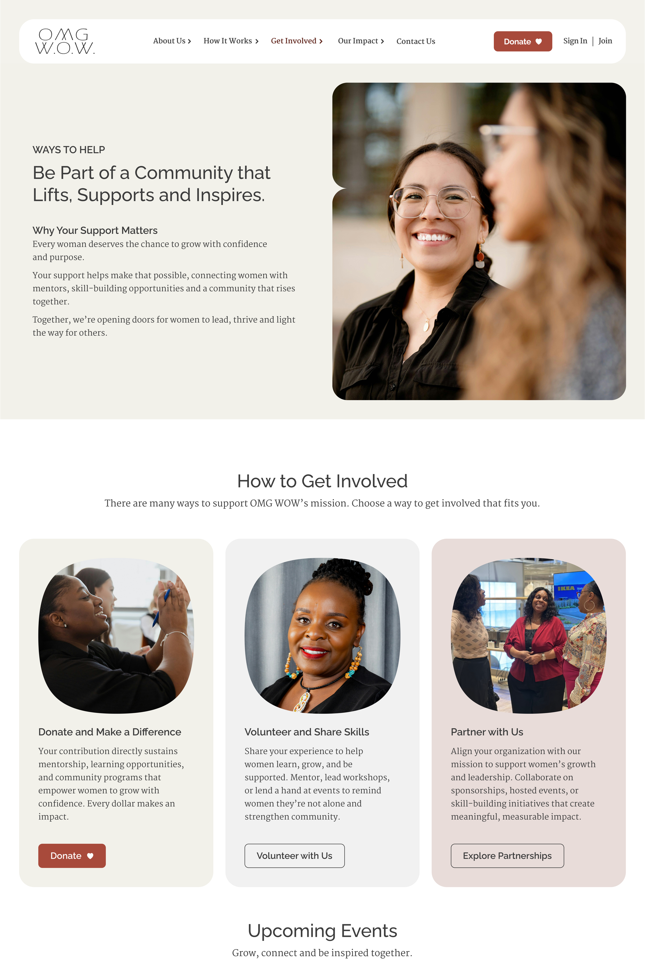 A single hub presenting three ways to engage: donate, volunteer, or partner. Clear pathways help visitors quickly find the option that aligns with how they want to support OMG WOW.
