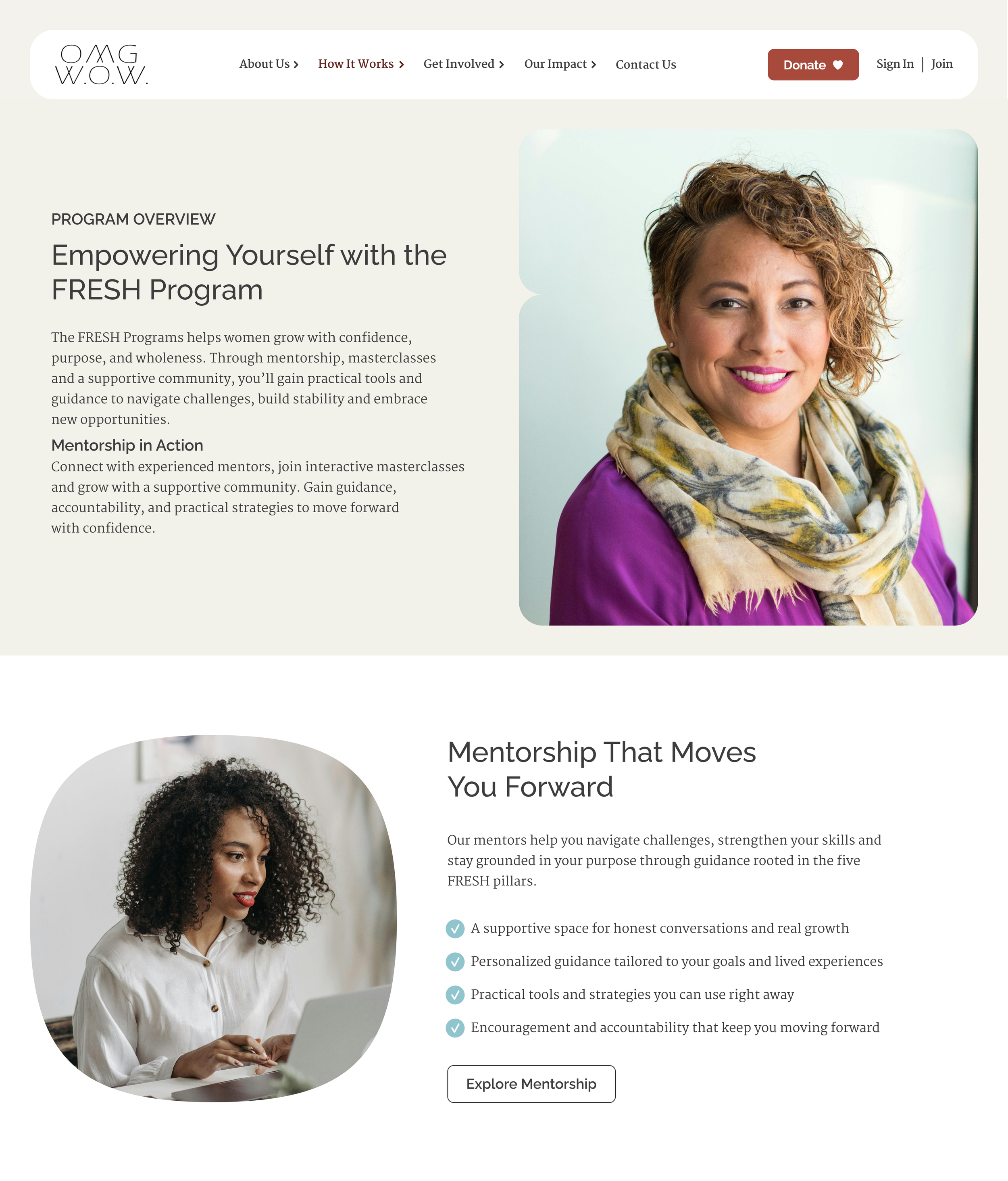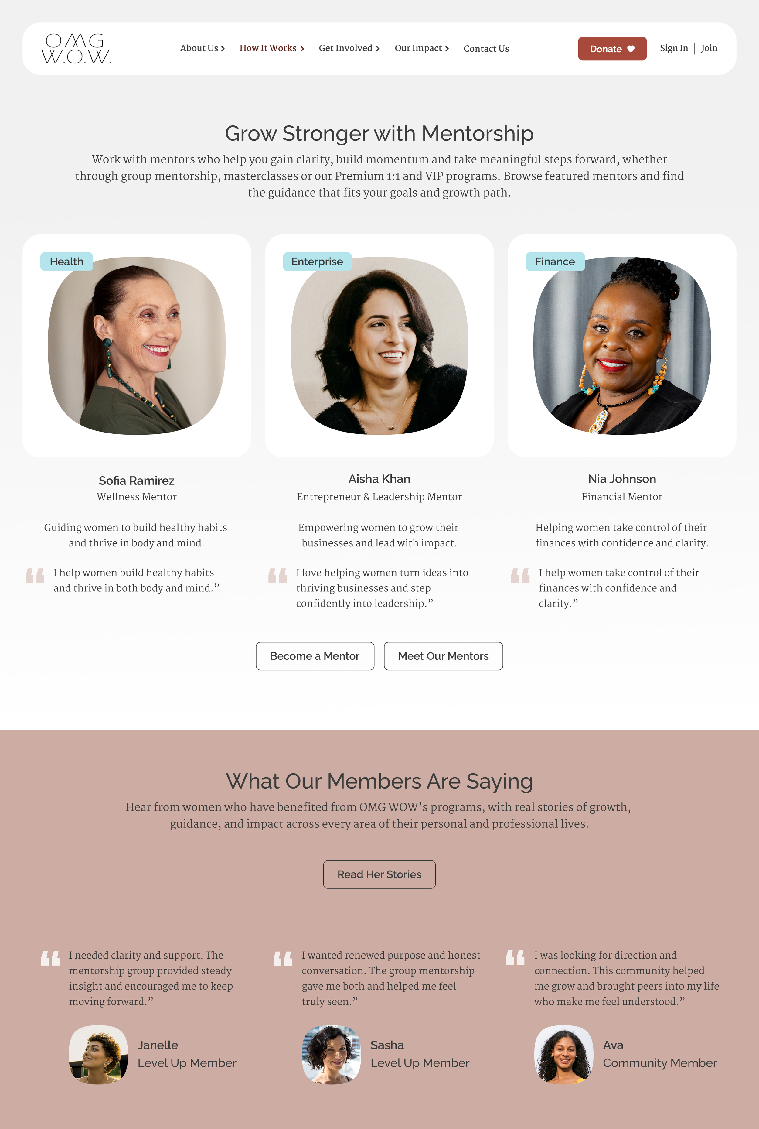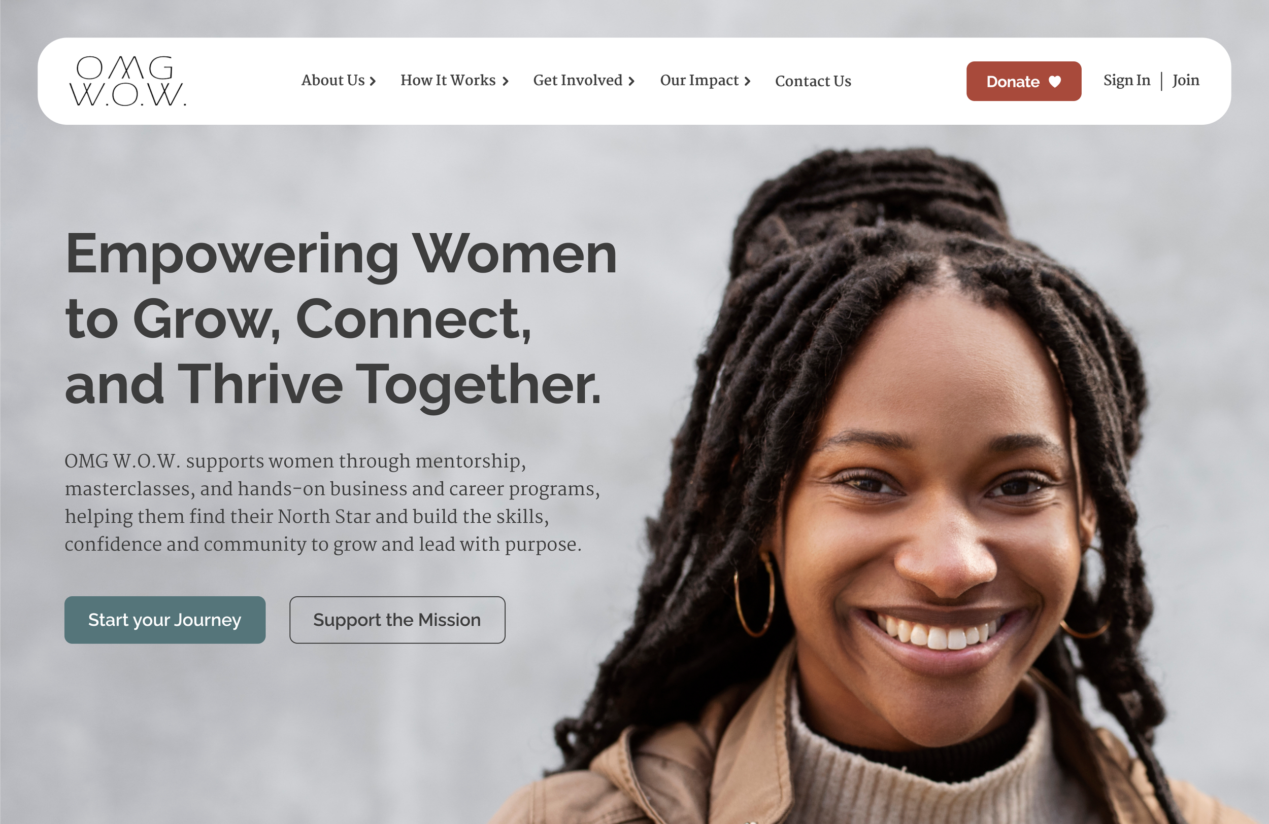 Redesigned OMG WOW’s nonprofit website to help women explore programs, connect with mentors, and take meaningful action. Focused on clarity, trust, and visible impact to create a mission-driven, engaging experience.